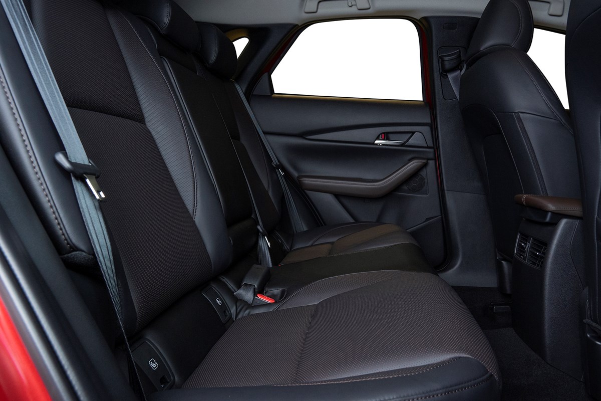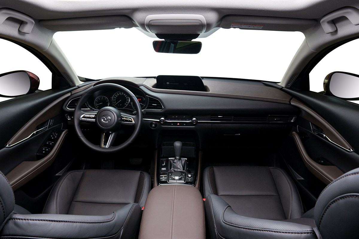 Bước vào bên trong, Mazda CX-30 thu hút với triết lý thiết kế lấy con người là trung tâm. Các chi tiết nội thất bày trí khoa học và đều được gia công tỉ mỉ. Trang bị nổi bật phải kể đến như nội thất da cao cấp, điều hòa tự động 2 vùng, phanh tay điện tử tích hợp chế độ giữ phanh Auto Hold, cửa sổ trời, cốp sau điều chỉnh điện.