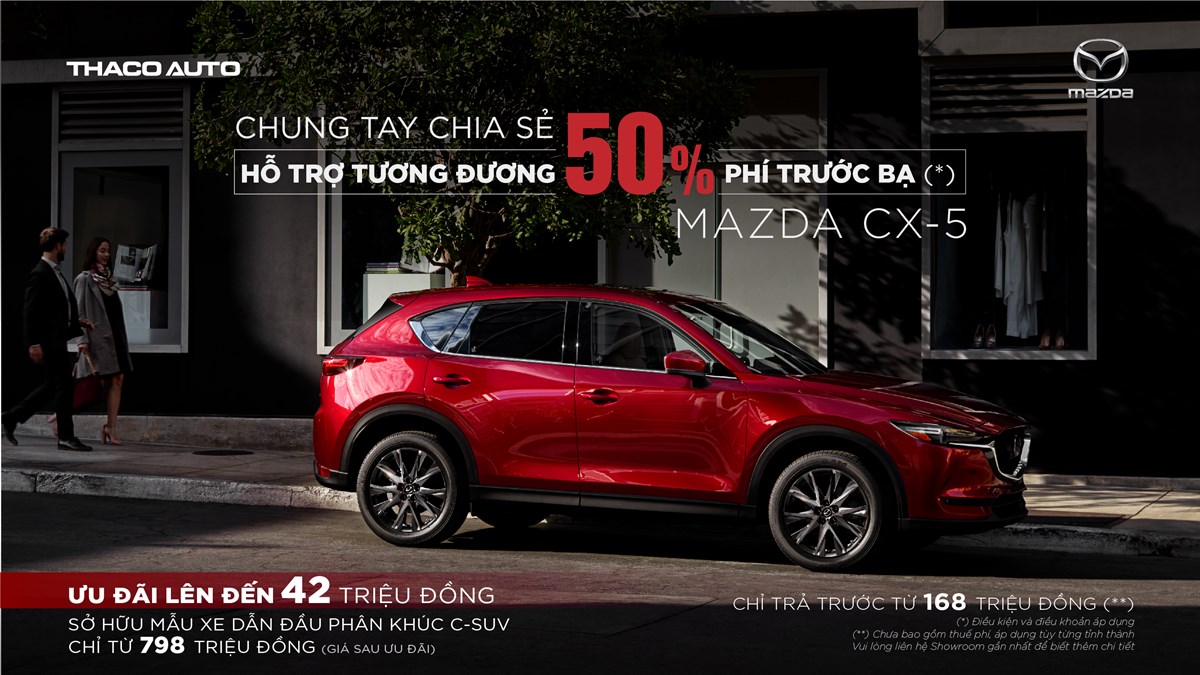 New Mazda CX-5, mẫu xe dẫn đầu phân khúc SUV tầm trung về doanh số đầu năm 2023 cũng đang được hỗ trợ tương đương 50% lệ phí trước bạ đối với phiên bản động cơ 2.0L, giá bán sau ưu đãi chỉ từ 798 triệu đồng. Đồng thời, với ưu đãi vay mua xe đang được áp dụng, khách hàng chỉ cần trả trước từ 168 triệu đồng.